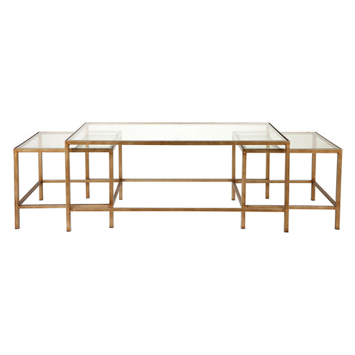 The Serene nesting coffee tables feature a contemporary curved stainless steel frame in an antique gold or black powder-coated finish with bevelled...